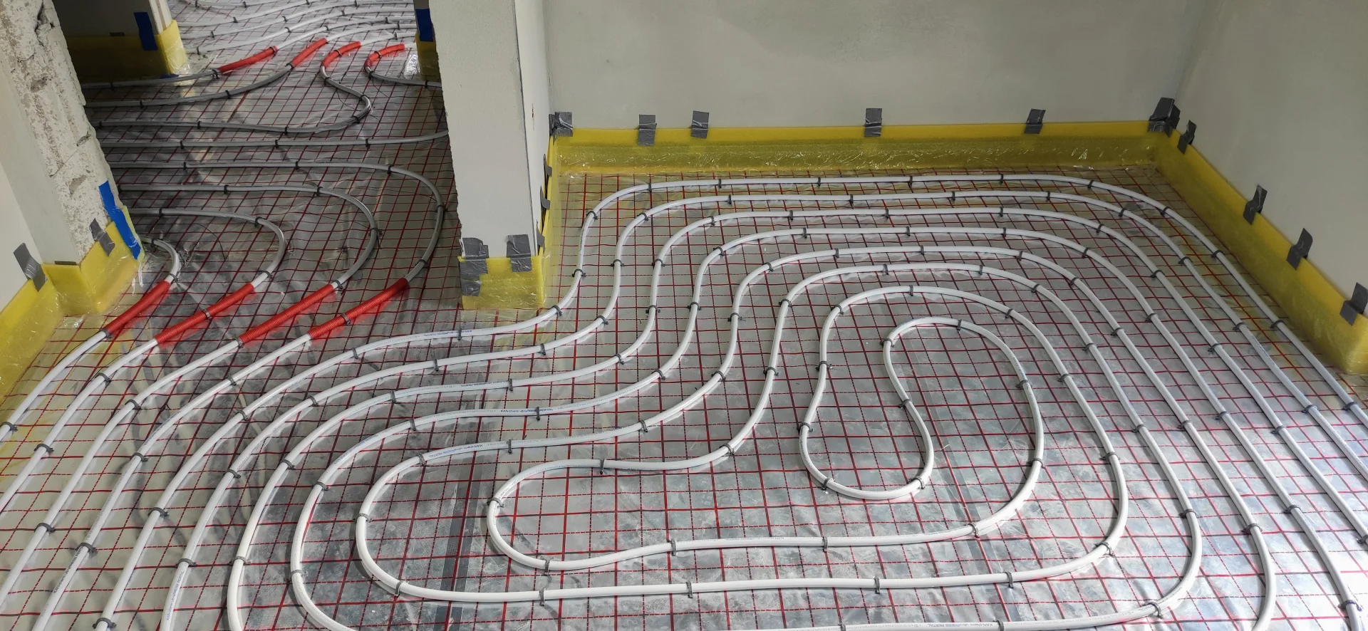 Kompleksowe instalacje hydrauliczne w domu jednorodzinnym obejmują pełny zakres prac, od zewnętrznych przyłączy po systemy grzewcze. Ogrzewanie podłogowe zostało precyzyjnie rozłożone na warstwie izolacji i folii w salonie, kuchni, sypialniach oraz w garażu, przy zachowaniu dylatacji z taśmy brzegowej i równomiernym prowadzeniu pętli na siatce z odpowiednimi wyprowadzeniami pod przyłącza. W ramach instalacji zamontowano rozdzielacze C.O. w szafkach z czytelnym oznaczeniem podejść oraz rozdzielacze wody użytkowej, a w maszynowni przygotowano kompletną armaturę i podłączenia. W kuchni oraz łazience wykonano podejścia wodno-kanalizacyjne, natomiast na zewnątrz zrealizowano przyłącze wodociągowe i kanalizacyjne do budynku w wykopie.