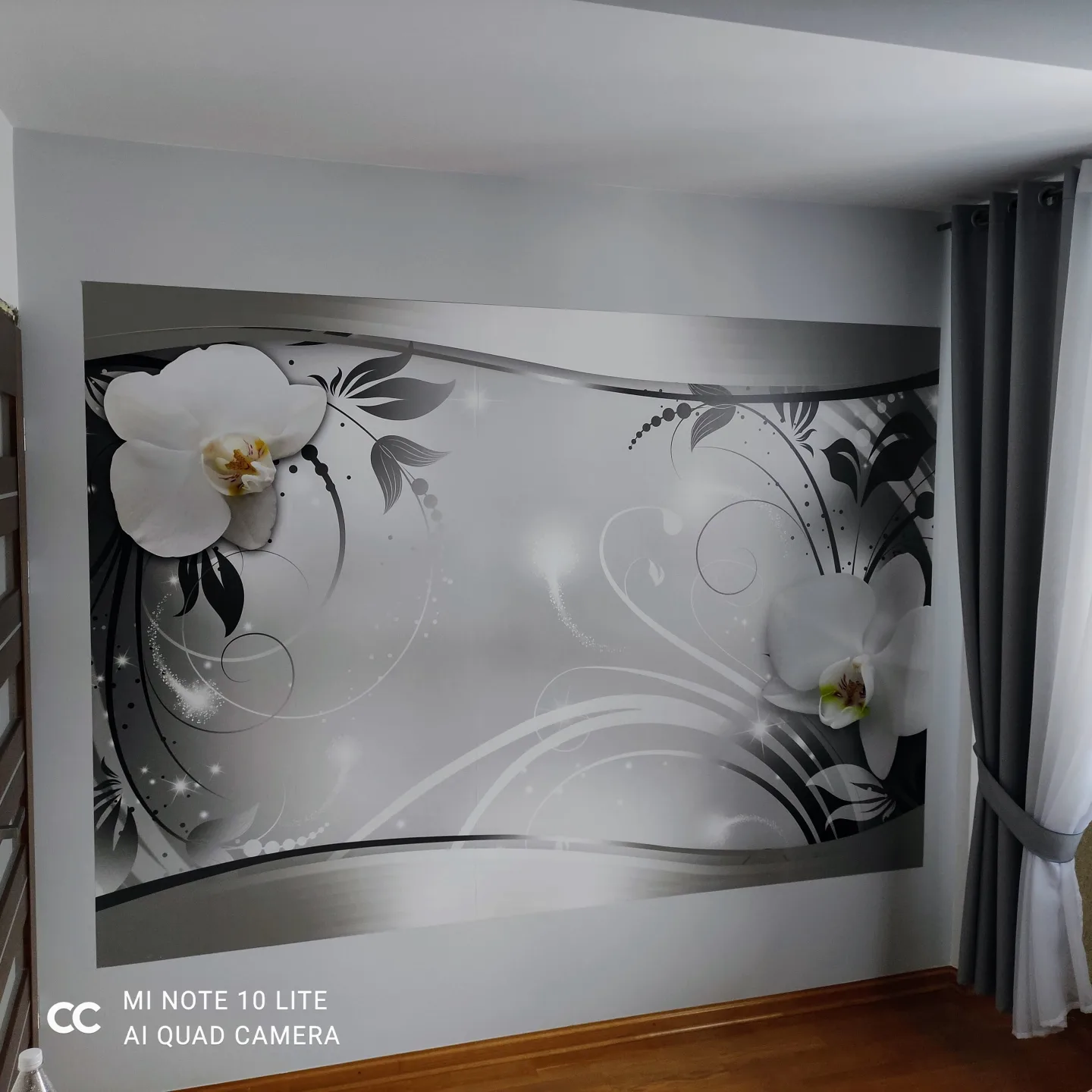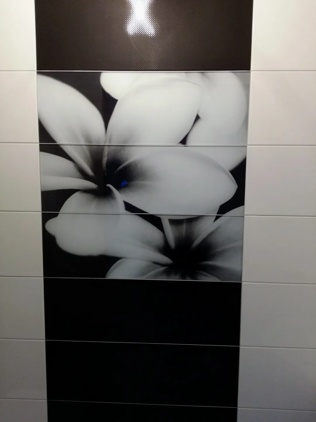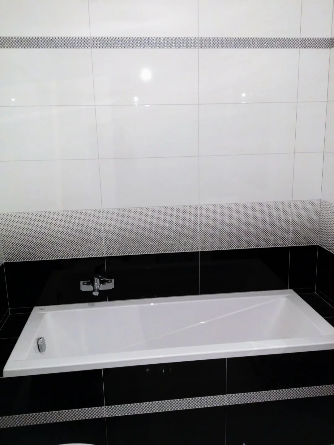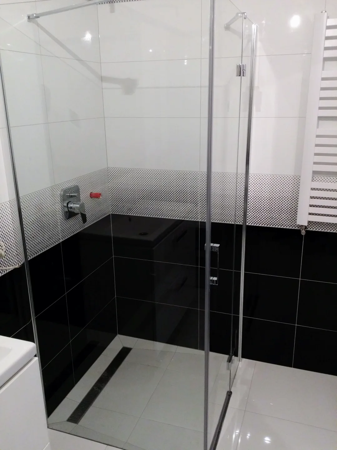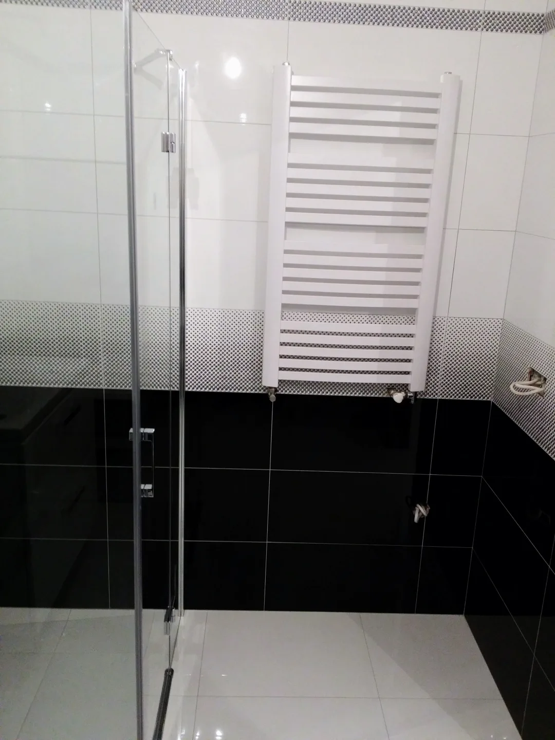 Galeria Wykończenie łazienki Leżajsk. Wnętrze w stylu czarno-białe płytki z pasem drobnej mozaiki i dużymi białymi formatami. Wanna w czarnej zabudowie z chromowaną baterią oraz prysznic walk in ze szklaną ścianką i odpływem liniowym. Zabudowa WC na tle czarnych płytek, biały grzejnik drabinkowy i dekor ścienny z motywem kwiatu. Wykonanie obejmowało m.in. układanie płytek. Jasna podłoga podkreśla kontrast, a czarne pasy porządkują strefę wanny i prysznica.