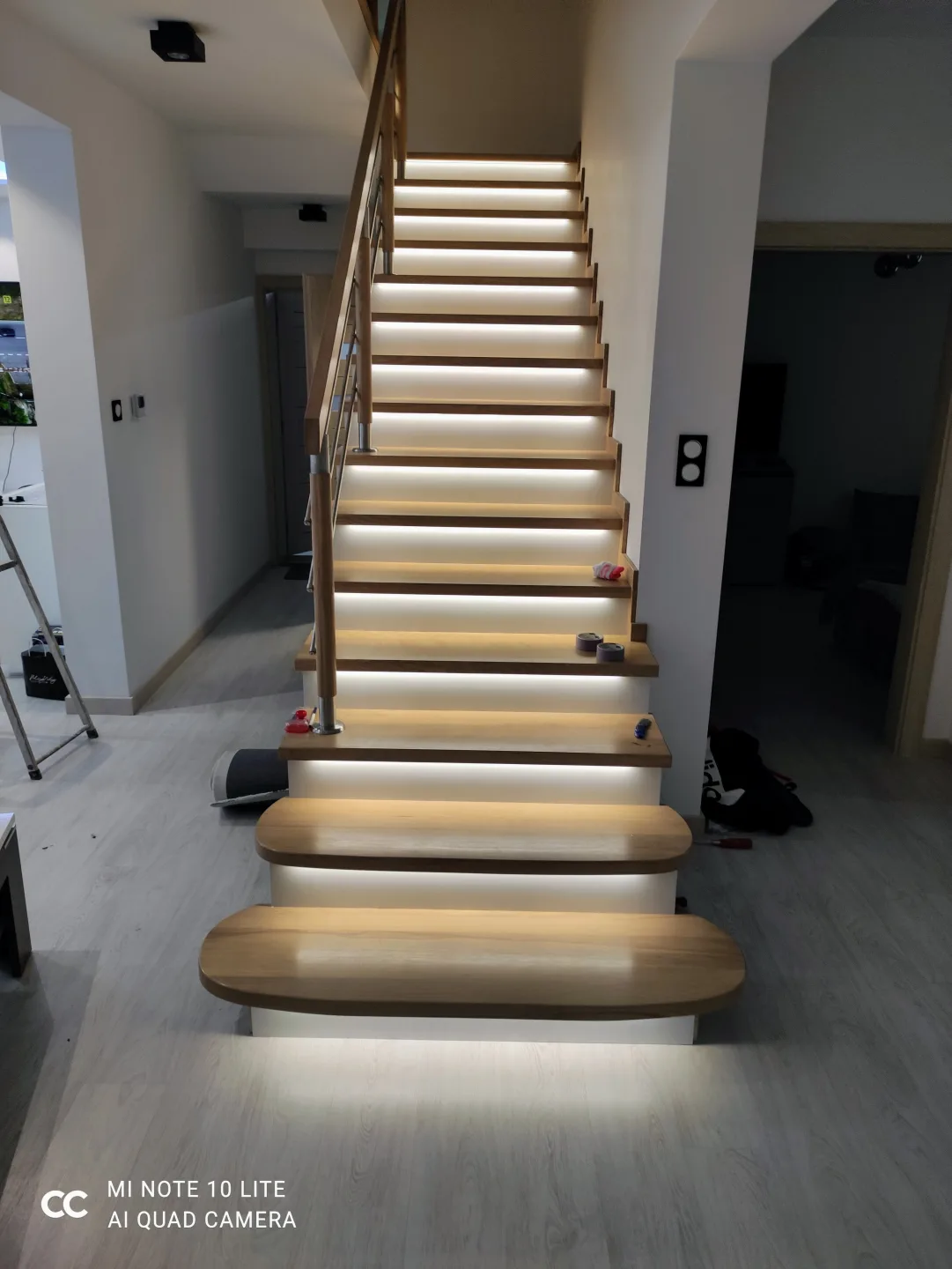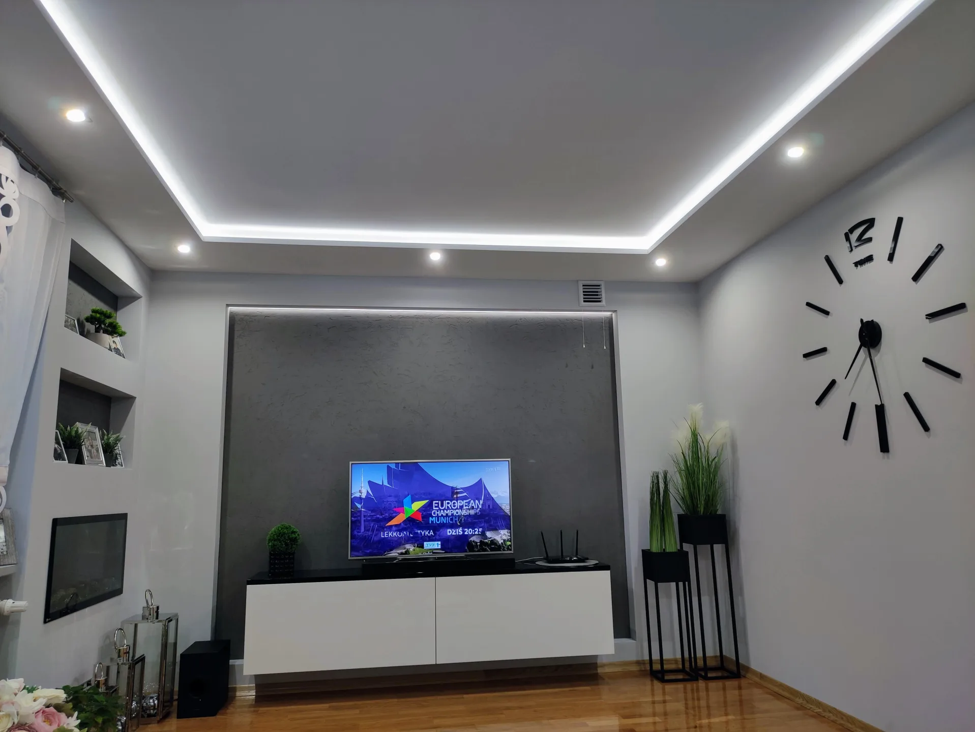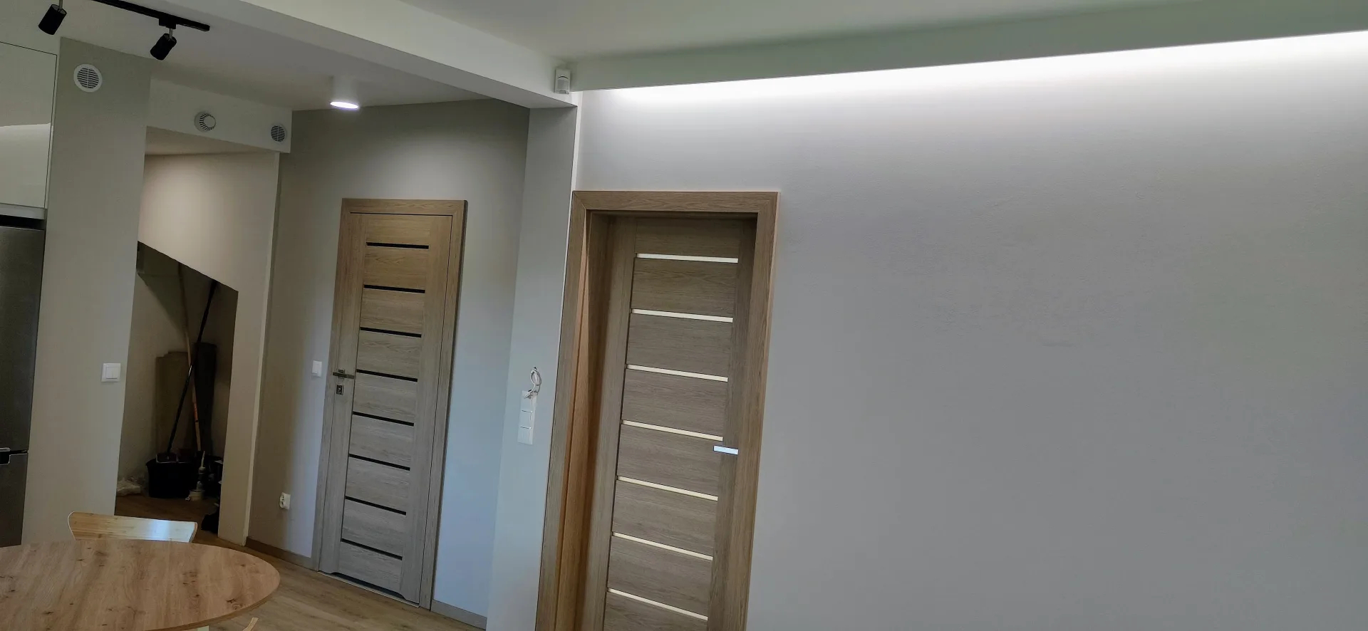 Nowoczesny remont domu w Leżajsku wyróżnia się spójnym wykończeniem wnętrz w bieli, szarości i drewnie, gdzie kluczową rolę odgrywa precyzyjnie zaprojektowane oświetlenie. W holu elegancka glinka włoska tworzy tło dla drewnianych drzwi, natomiast w salonie wzrok przyciąga sufit podwieszany z oświetleniem punktowym i LED oraz strefa TV z ciemnym panelem, białą szafką, wbudowanymi półkami i kominkiem elektrycznym. Drewniane schody zyskały nowoczesny charakter dzięki połączeniu podświetlenia liniowego i bocznych punktów świetlnych, a jeden z pokoi zdobi stylowa fototapeta w odcieniach szarości. Łazienka została zaprojektowana jako strefa relaksu z podświetlaną wanną, dekoracyjnymi wnękami LED nad wanną i stelażem WC, a także podświetlanym lustrem nad umywalką i białym grzejnikiem drabinkowym.