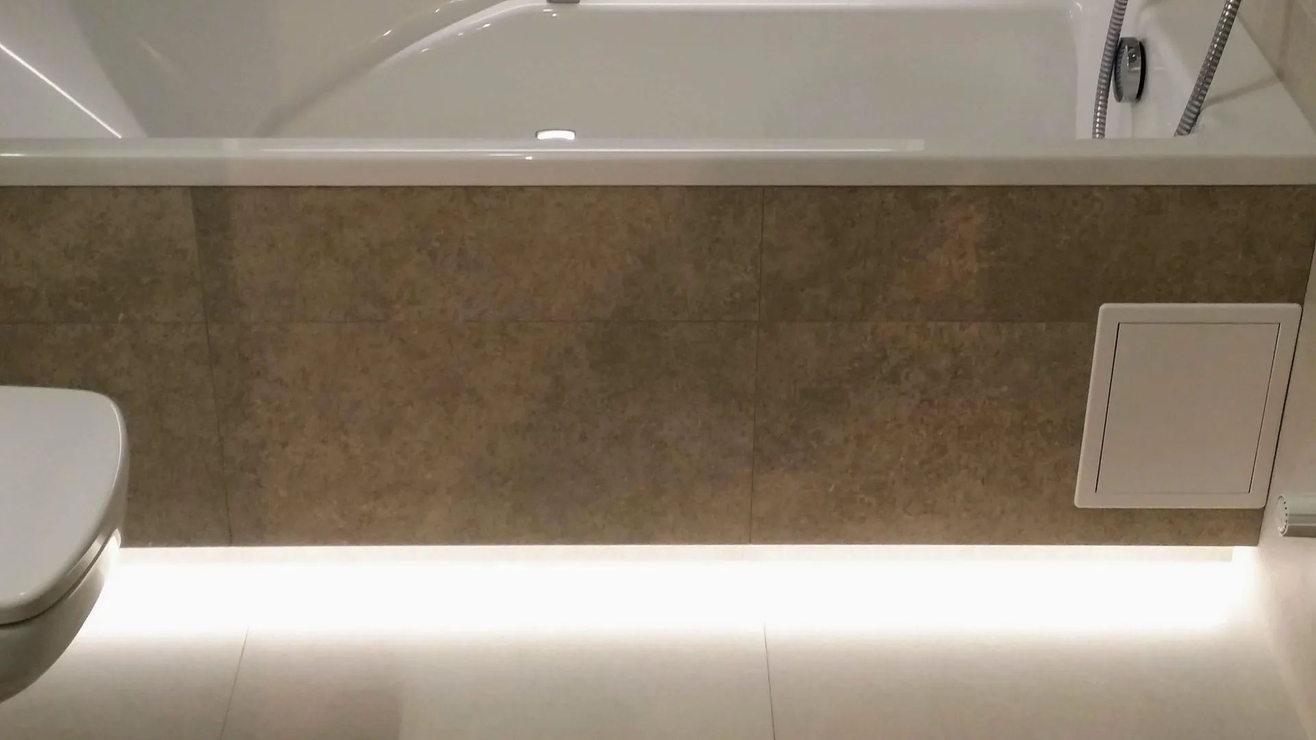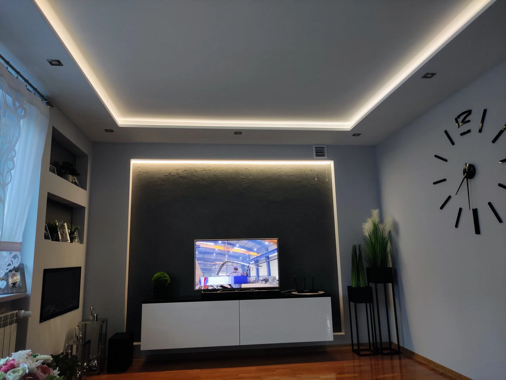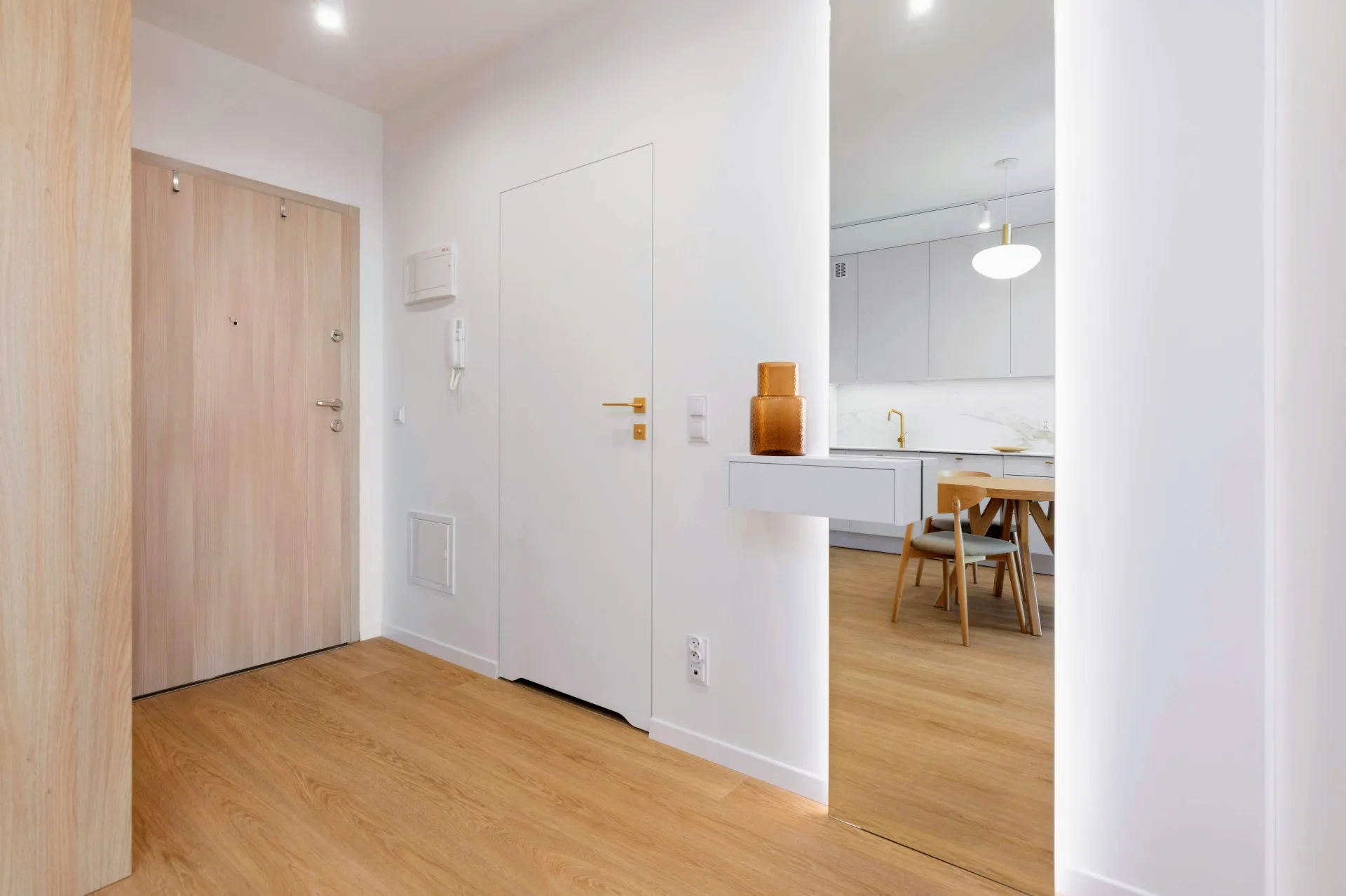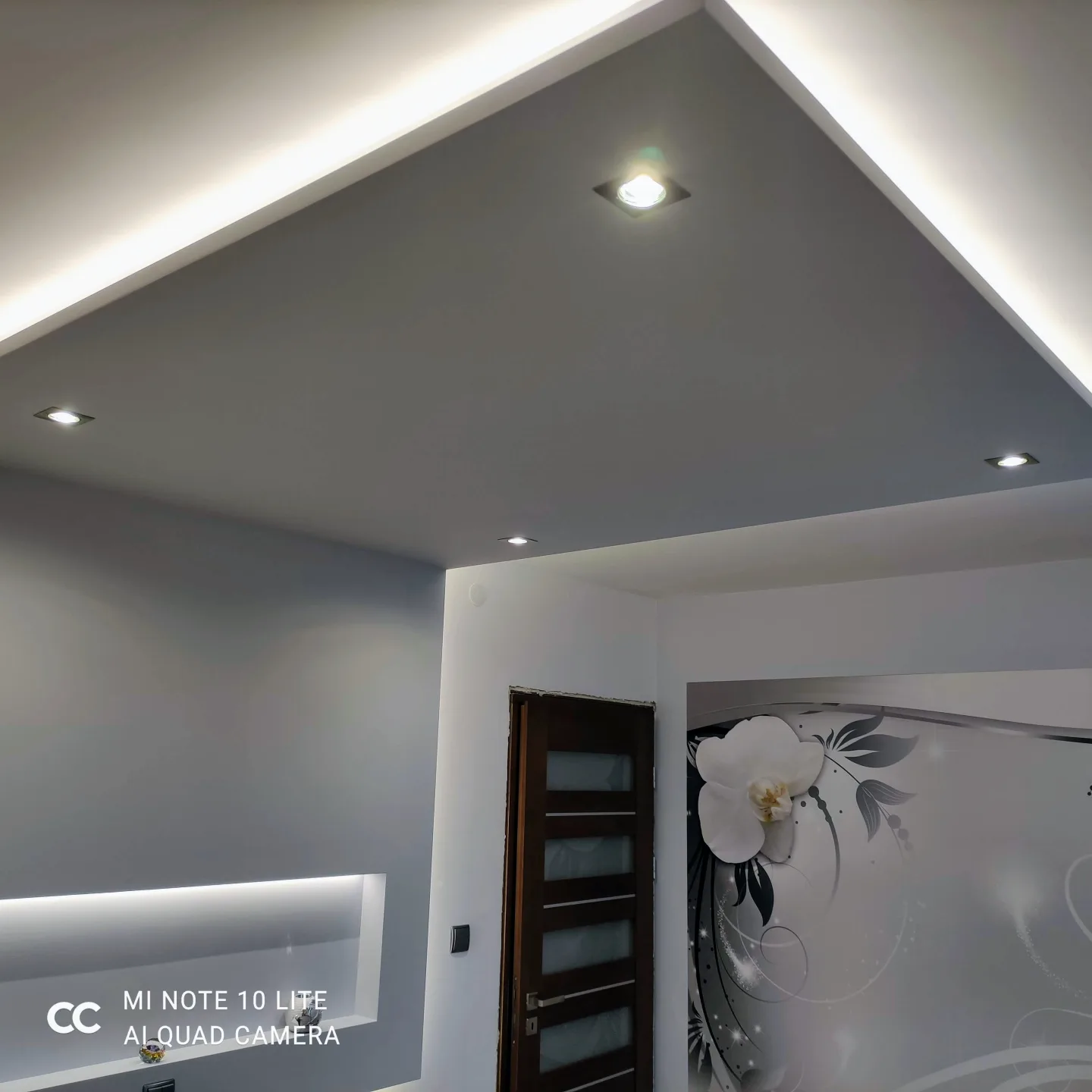 Nowoczesny remont domu w Leżajsku wyróżnia się spójnym wykończeniem wnętrz w bieli, szarości i drewnie, gdzie kluczową rolę odgrywa precyzyjnie zaprojektowane oświetlenie. W holu elegancka glinka włoska tworzy tło dla drewnianych drzwi, natomiast w salonie wzrok przyciąga sufit podwieszany z oświetleniem punktowym i LED oraz strefa TV z ciemnym panelem, białą szafką, wbudowanymi półkami i kominkiem elektrycznym. Drewniane schody zyskały nowoczesny charakter dzięki połączeniu podświetlenia liniowego i bocznych punktów świetlnych, a jeden z pokoi zdobi stylowa fototapeta w odcieniach szarości. Łazienka została zaprojektowana jako strefa relaksu z podświetlaną wanną, dekoracyjnymi wnękami LED nad wanną i stelażem WC, a także podświetlanym lustrem nad umywalką i białym grzejnikiem drabinkowym.