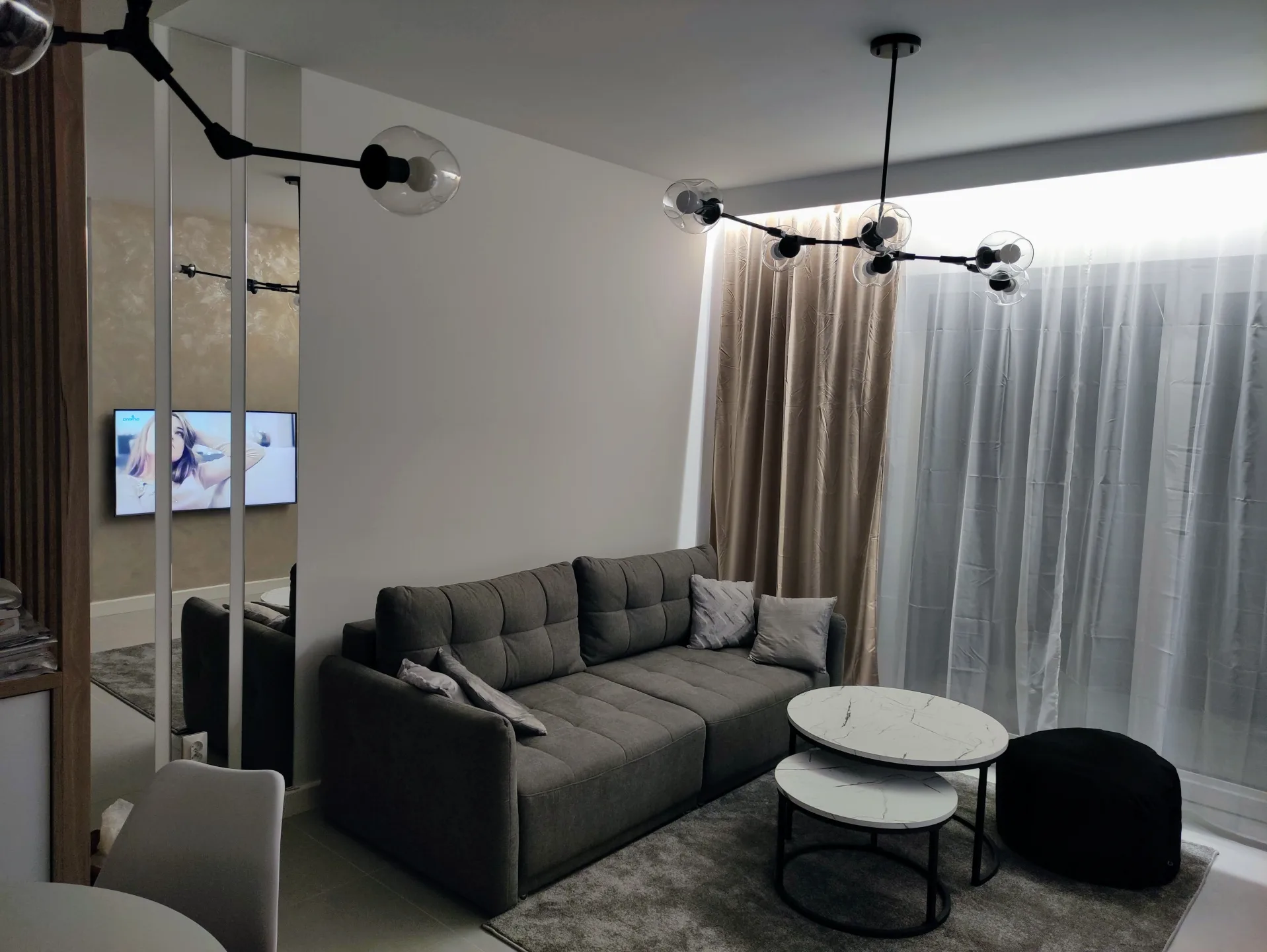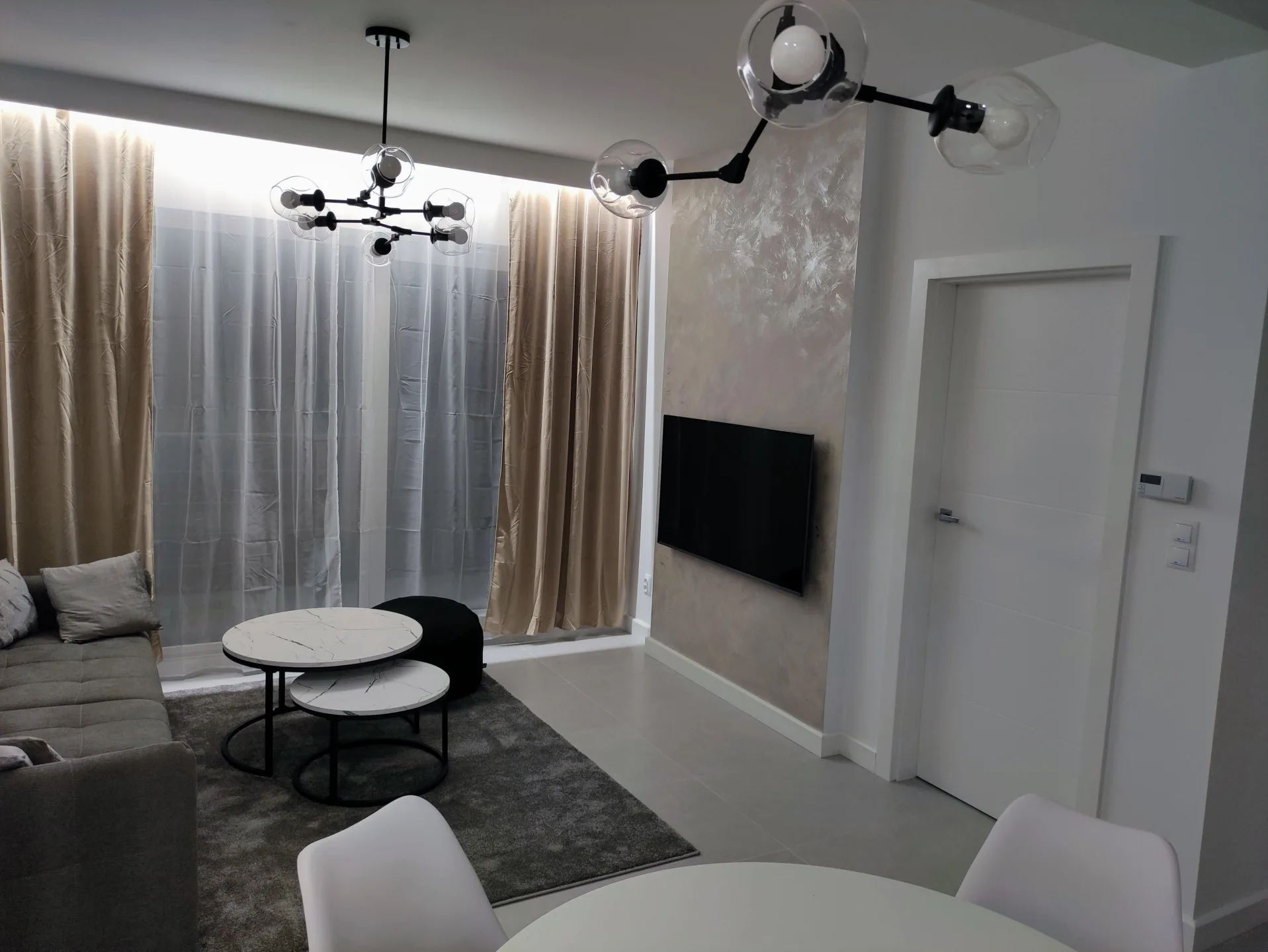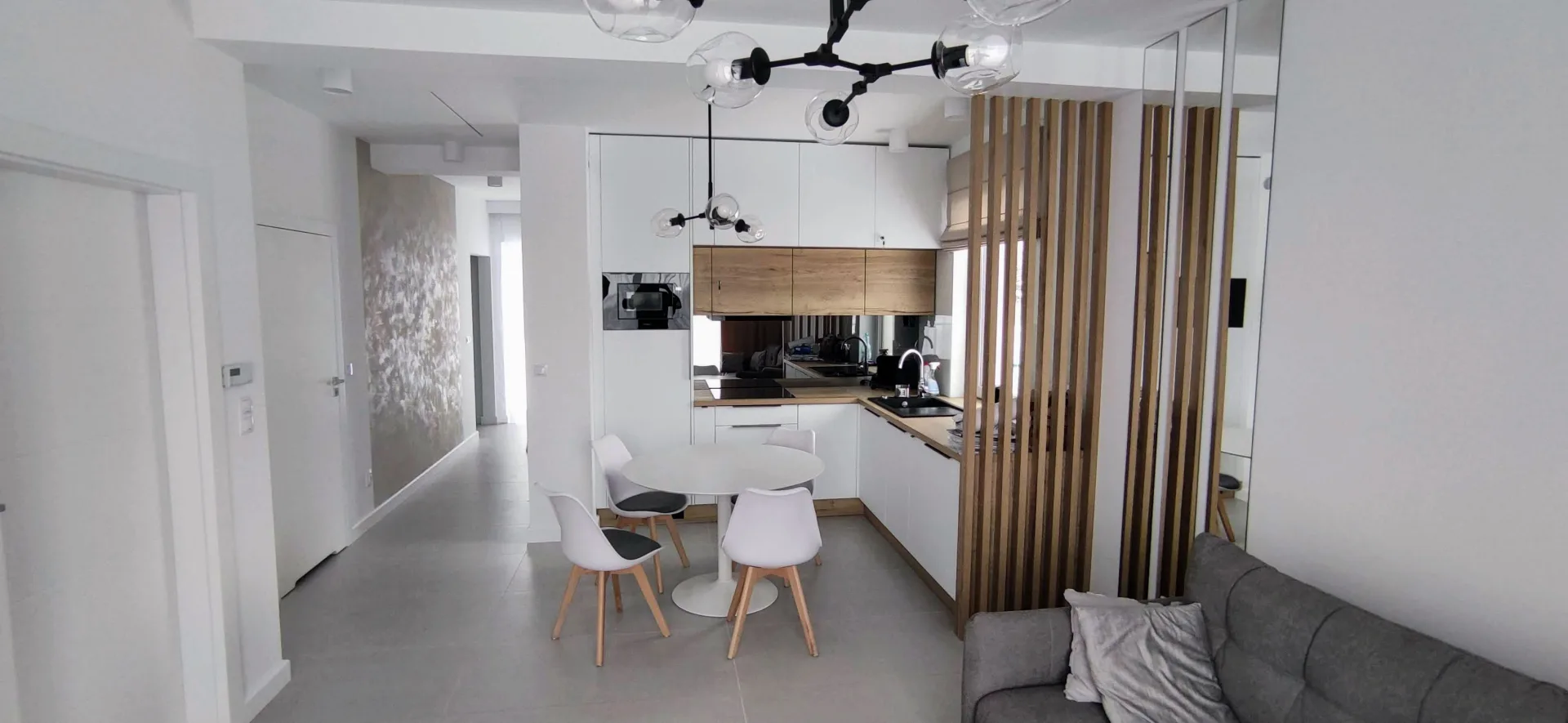 Wykończenie apartamentów w Polanicy Zdroju w jasnej, nowoczesnej stylistyce. Salon z aneksem ma białą zabudowę z drewnianym blatem i czarny zlewozmywak. W części dziennej widać sofę, stół oraz lustra na ścianie, nad stołem lampę z kloszami. Przedpokój wykończono płytkami i ścianą dekoracyjną, a w pokojach zastosowano fototapetę. Łazienki w szarościach i drewnie mają kabinę prysznicową, wannę z parawanem, zabudowę WC z niszą oraz podświetlenia LED przy półkach i wannie. Zastosowano też panele winylowe. Na klatce schodowej widać płytki i barierkę, a na zewnątrz plac zabaw oraz strefę wypoczynku.