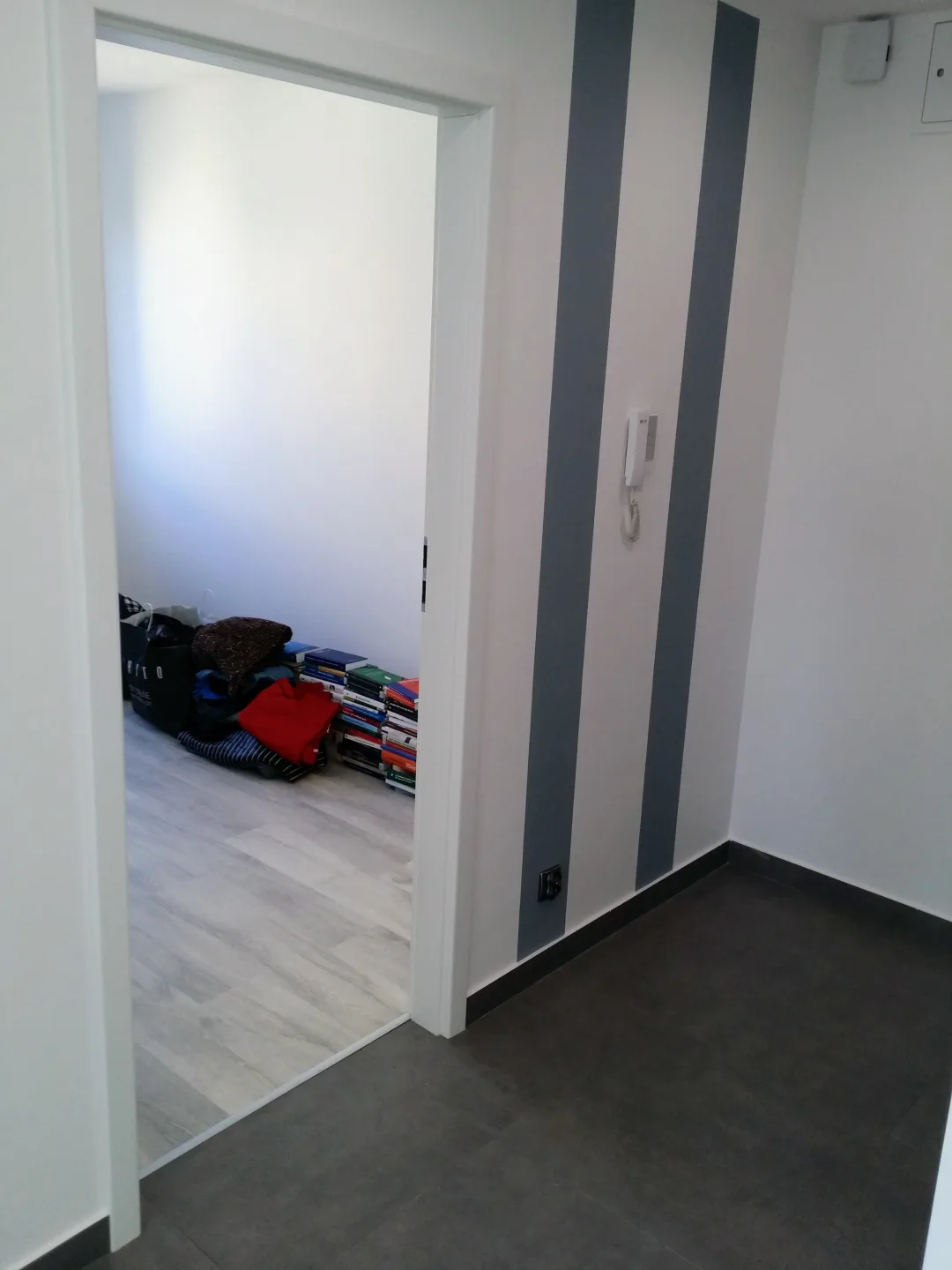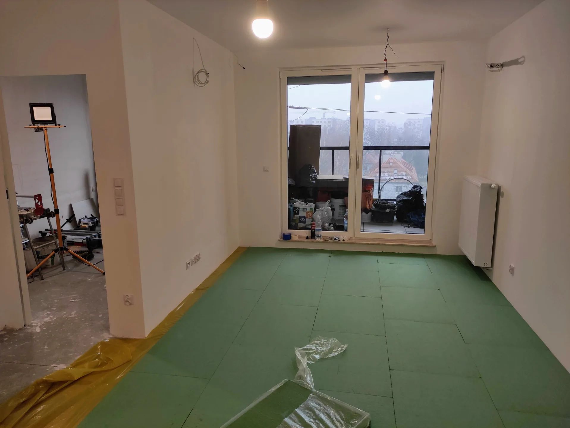 Wykończenie mieszkania w Krakowie etap przed. Widać prace przygotowawcze i instalacyjne, skuwanie i wyburzanie, murowanie ścian oraz tynkowanie i gruntowanie. W łazience wykonano hydroizolację, przygotowano konstrukcję pod wannę, zamontowano i zabudowano stelaż WC oraz wannę. Trwało układanie płytek i fugowanie, montaż baterii wannowo prysznicowej oraz grzejnika. Montowane były drzwi ukryte, oświetlenie led, listwy przypodłogowe oraz folia i podkład pod panele. Na koniec porządkowanie gruzu.