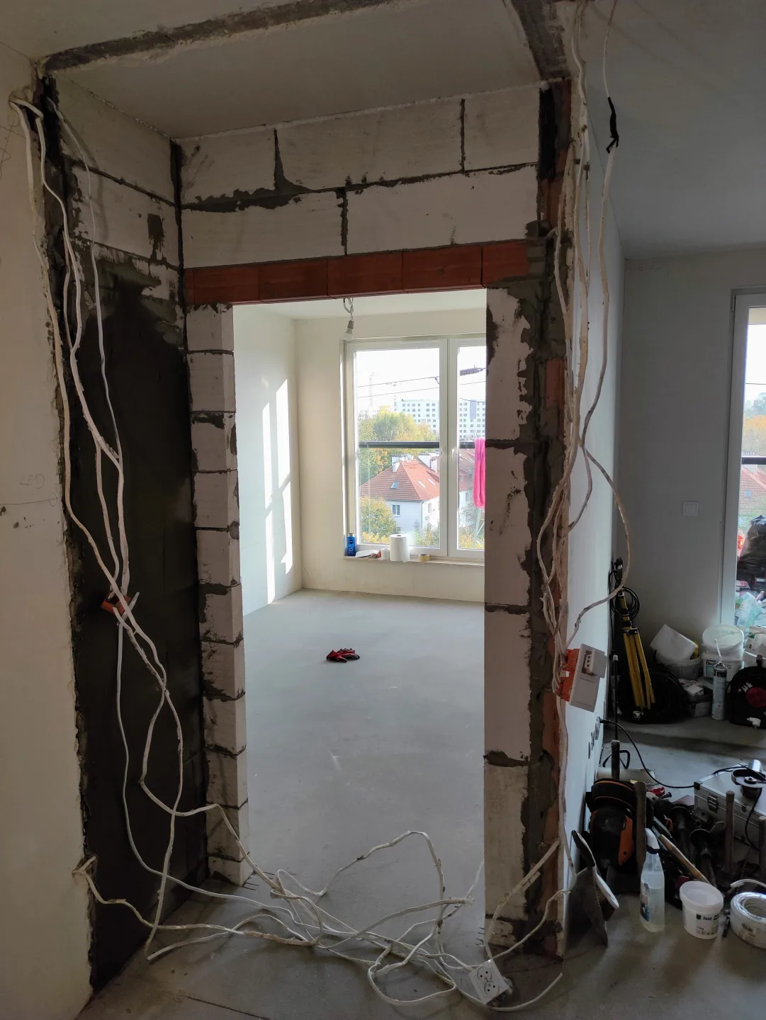 Realizacja instalacji elektrycznej w trakcie prac obejmuje kompleksowe przygotowanie okablowania oraz osprzętu. W ścianach wykonano precyzyjne bruzdy, w których ułożono przewody gniazd wtykowych i punktów oświetleniowych, prowadząc je w korytach pod sufitem oraz przy otworach drzwiowych. Wszystkie puszki zostały osadzone, a kable zabezpieczono przed tynkowaniem i starannie zaklejono w bruzdach. Centralnym punktem instalacji jest rozdzielnica wpuszczana w ścianę, prezentująca etap przed montażem oraz efekt końcowy z uporządkowanym okablowaniem i czytelnie opisanymi obwodami, wyłącznikami oraz zabezpieczeniami. Całość uzupełnia dodatkowa skrzynka, przygotowane przepusty oraz szczegółowy schemat instalacji, który zapewnia bezproblemową obsługę i późniejszy serwis.