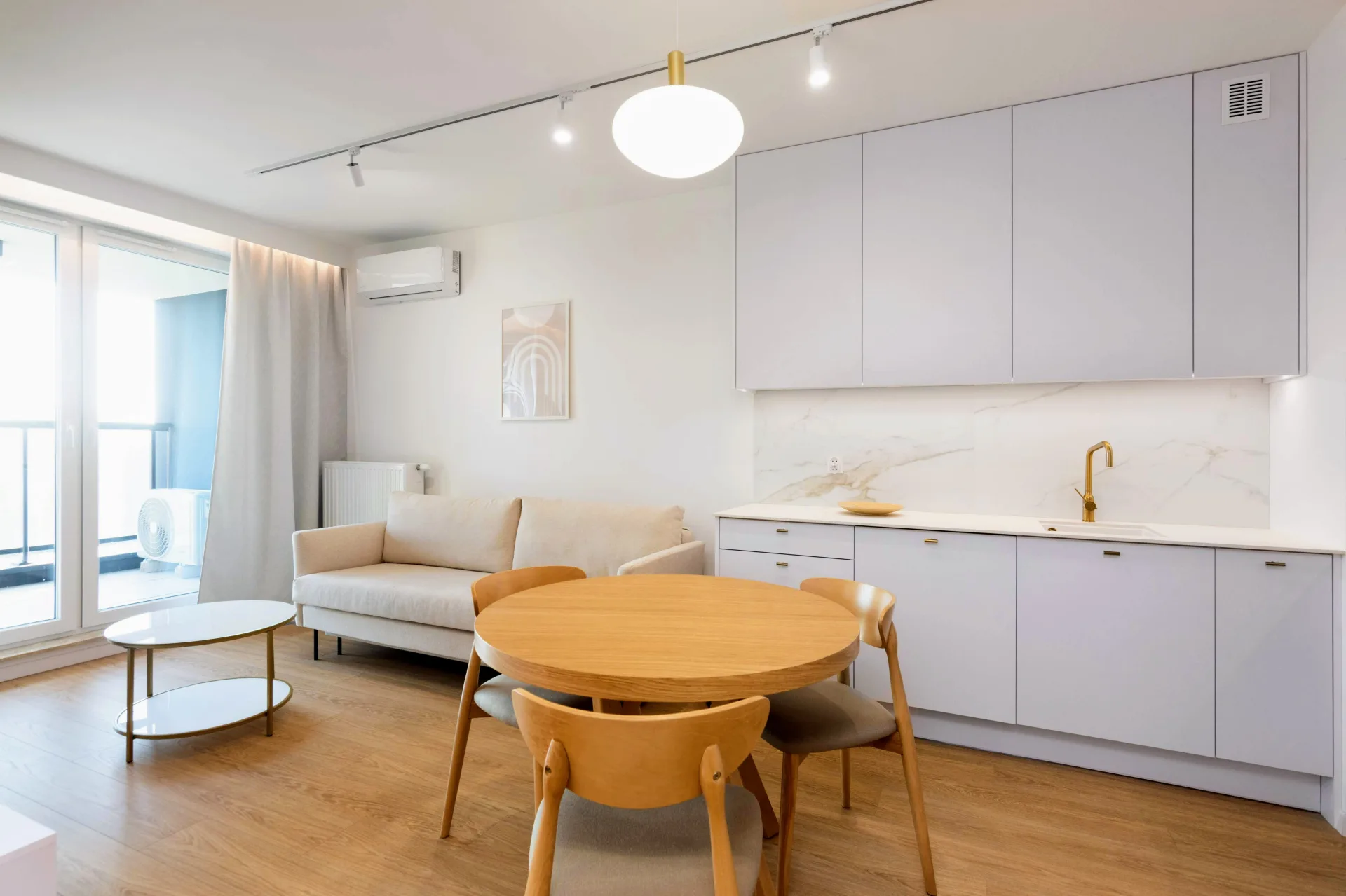 Gotowe wnętrza są jasne i spójne, z drewnianą podłogą i białymi ścianami. Salon połączony z kuchnią ma białą zabudowę, jasny blat i ścianę w marmurkowym wzorze oraz złotą baterię. W części dziennej stoi sofa i okrągły stół, a na ścianie jest drewniana zabudowa z telewizorem. W przedpokoju znajduje się lustro. Sypialnia ma zabudowę i biurko w rogu. Łazienka w beżowych płytkach ma wannę z parawanem, umywalkę z podświetlanym lustrem i WC w zabudowie.